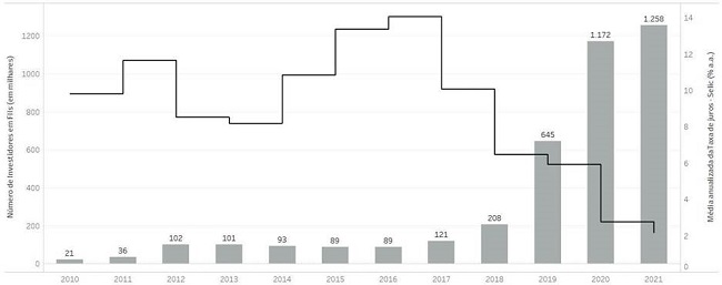 Em relação à origem da fonte de recursos, verifica-se pontualmente a expansão da base de investidores em 2011 e, de modo mais sustentado, a partir de 2017. Em 2020, a marca atingiu a expressiva quantidade de um milhão de investidores em FIIs, que continuou a crescer. Segundo dados da B3 (2021), atualmente há quase 1,3 milhões de investidores, cuja composição é majoritariamente de pessoas físicas (99,55%), seguido por outros (0,35%), investidores institucionais (0,09%) e não residentes (0,01%). A maior concentração de investidores pessoa física também reflete maiores posições de custódia e volume negociado no mercado de capitais, de 73,8% e 68,2%, respectivamente; enquanto a exposição dos investidores institucionais flutua em torno de 20% para ambas as posições.