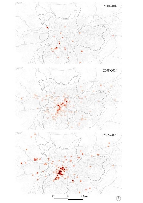 Ao passo em que a matriz institucional do instrumento amadureceu e o cenário macroeconômico se tornou mais favorável ao desenvolvimento da indústria de FIIs, o Figura 3 destaca três períodos que evidenciam a escala e proporção que o fenômeno adquiriu na Região Metropolitana de São Paulo ao longo das últimas duas décadas. A partir dos Fundos de Investimento Imobiliário listados na Bolsa de Valores (B3), a pesquisa compilou 411 propriedades detidas por FIIs que foram representadas tão somente nos períodos elencados. O primeiro momento, entre 2000 e 2007, situa um estágio ainda incipiente que antecede o período de crescimento mais sustentado, notado no ínterim de 2008 a 2014. O período entre 2015 e 2020, engloba o momento de estabilização e posterior crescimento da indústria, demonstrando a intensificação de determinadas dinâmicas que já transcorriam desde a fase anterior.