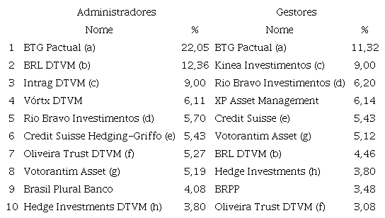 O panorama geral revela que os dez maiores administradores detêm 78,99% de participação na indústria de FIIs, enquanto os dez maiores gestores possuem 58,2%. Ou seja, há uma grande concentração de patrimônio imobiliário em mãos de alguns poucos Grupos Econômicos. Também é possível observar uma forte centralização de atividades, em que um mesmo grupo cumpre as atribuições de administração e gestão dos FIIs. Como observado na Tabela 1, seis das dez maiores empresas desempenham ambas as funções.