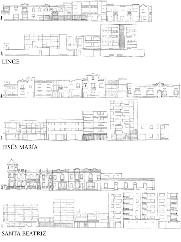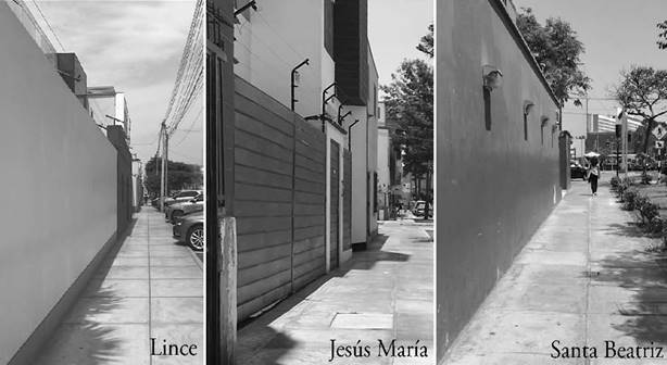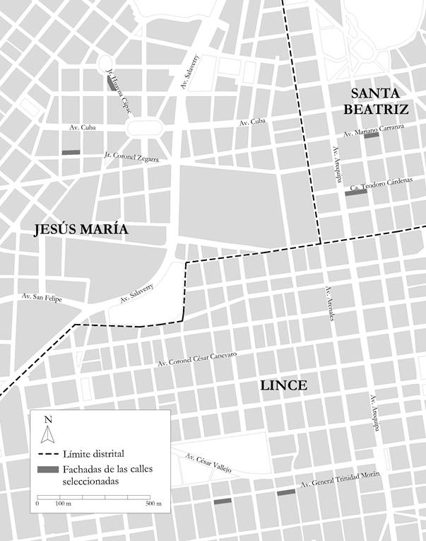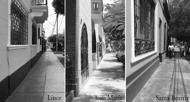 Caminar por las calles de Lima implica ser testigo del cambio formal de las diversas fachadas de una calle. Decenas de edificios han sido derrumbados para dar paso a otros nuevos, pero con una organización ornamental distinta y entre los distritos que más han acogido estos cambios están los de la zona suroeste. Este fue uno de los motivos para seleccionar los barrios de Lince, Jesús María y Santa Beatriz. Primero se seleccionaron calles en donde sus fachadas ya habían cambiado -caso típico de esos tres barrios- y luego se buscaron calles cerca de ellas en donde sus fachadas aún se conserven (Figura 3).