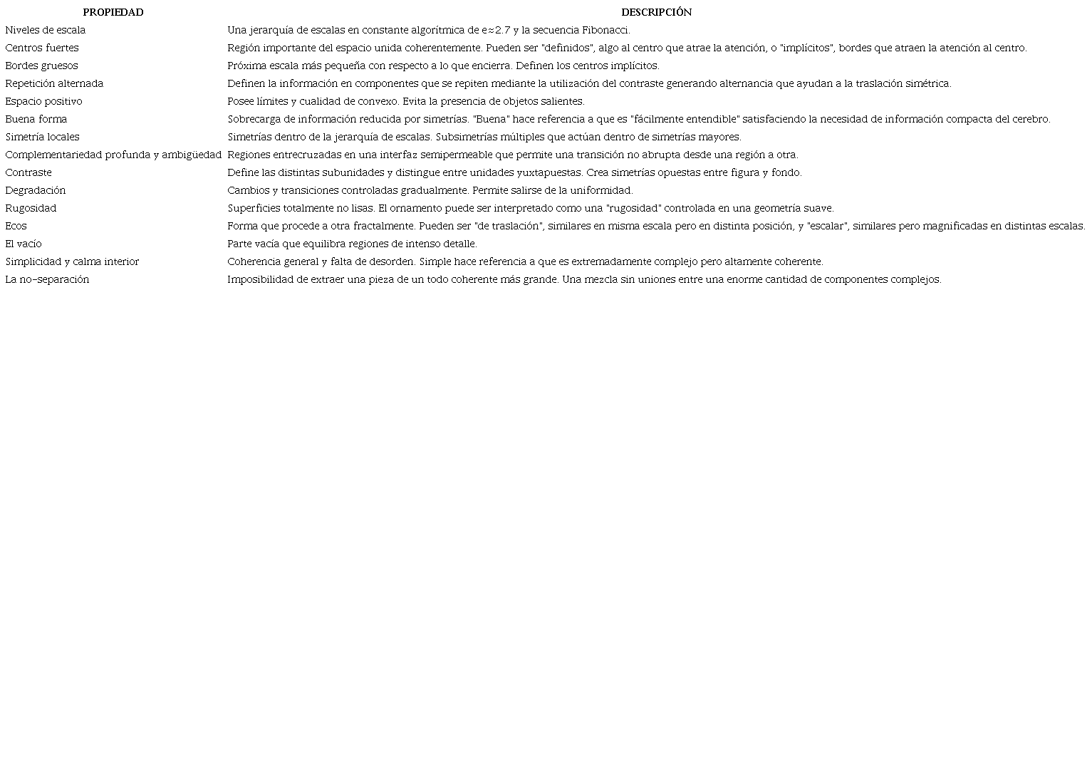 Siguiendo ese camino, Alexander (2002) en un intento por objetivar y hacer mesurable esa idea propuso 15 propiedades formales (Tabla 1) que influían en el nivel de vida de las cosas. Él aseguraba que referirse a las cosas como muertas o vivas era impreciso, siendo mejor indicar el nivel de vida identificado en estas.