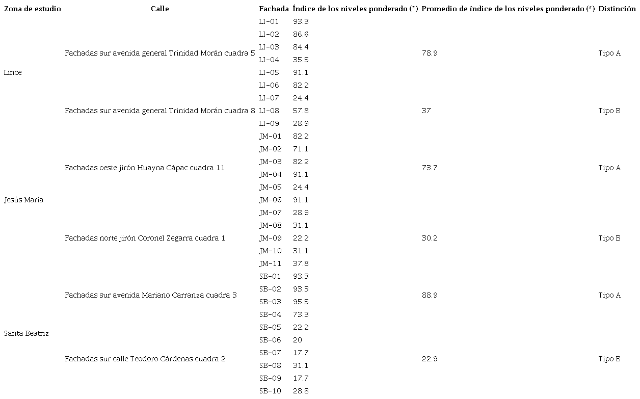 Dentro de las calles seleccionadas se catalogó cada fachada con un código y fueron analizadas bajo un índice de existencia y manipulación de las 15 propiedades formales de Alexander (2002), lo que distinguió a las fachadas en dos tipos, identificando a las de mayor porcentaje como Tipo A y a las de menor como Tipo B (Tabla 2). Para Alexander, realizar esa distinción reflejaría el nivel de vida de cada una de esas fachadas.
