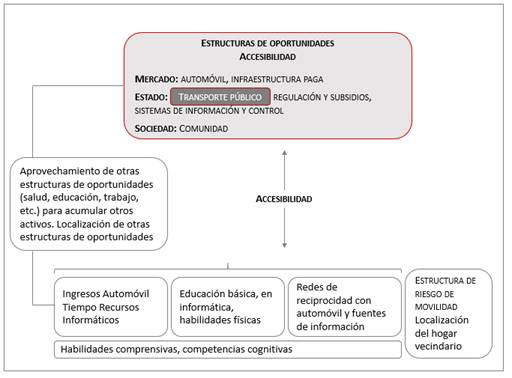 Dentro del marco analítico de Hernández (2012), este trabajo propone dirigir la mirada hacia las estructuras de oportunidades de accesibilidad (resaltadas en gris en la Figura 1), entendidas como condiciones que favorecen u obstaculizan a las personas al momento de movilizar sus recursos y activos propios. Estas estructuras de oportunidades -cuyas fuentes son las tres grandes instituciones del orden social: el mercado, el Estado y la sociedad- son factores que no dependen de la voluntad individual, y operan como factor estructural de constreñimiento a su accionar. Y, en este marco, se propone centrarse en el transporte público, entendido como un componente de las estructuras de oportunidades de accesibilidad, que forma parte de un espectro mucho más amplio.