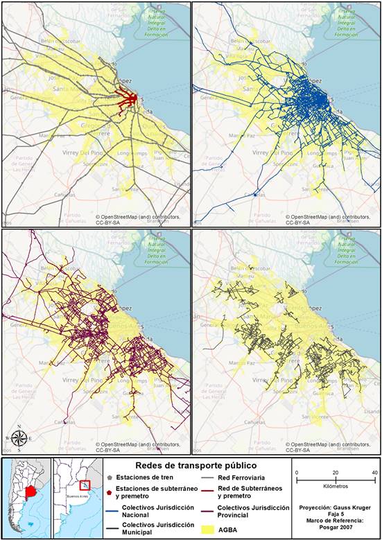 En la actualidad, la red de transporte público del AGBA se compone por la red ferroviaria metropolitana, que conecta el centro con la periferia en un sentido radial, en cuyas cabeceras se encuentran los centros de transbordo que conectan con otros modos de transporte: el transporte automotor de jurisdicción nacional, cuya extensión también sigue un sentido radial, pero concentra la mayor oferta en la CABA y su cercanía; las líneas de transporte automotor de jurisdicción provincial y municipal, que son clave en las zonas donde la red ferroviaria y los colectivos de jurisdicción nacional no están presentes; y la red de subterráneos y el premetro, que no supera los límites de CABA, siguiendo también un sentido radial, orientada a la población que habita dentro y a la que puede conectar, por medio de los centros de transbordo, con los ramales de tren o líneas de colectivos (Figura 5).