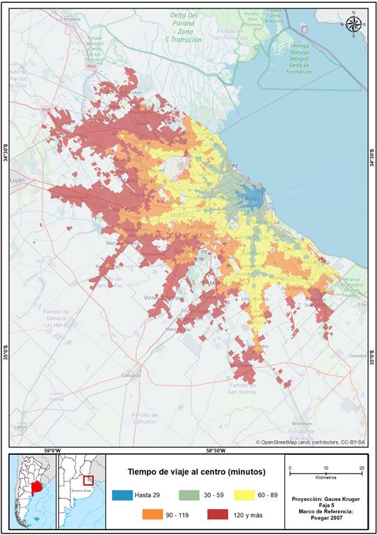 Abstract: Within the framework of studies on accessibility, this article proposes to address the conditions offered by public transportation -understood as a structure of opportunities that provides access to urban goods and services-, taking the Greater Buenos Aires as spatial universe. Based on a Google tool that collects data from the public transport network in its multiple modes, an indicator is constructed (travel time to the city center) which allows working on a metropolitan scale and, at the same time, provide an account of the microspatial differentials configured within it, in a cross talk with urban expansion processes and the patterns of socio-economic spatial distribution. Thus, it is observed that the unequal way in which public transport networks are distributed configures a restrictive structure of opportunities for the population residing in peripheral areas of the agglomerate and in the interstices of its growth axes, contributing to the reproduction of socio-spatial inequalities.