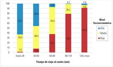 Estas condiciones de accesibilidad se configuran como una capa más de desigualdad, superpuesta y atravesada por las desigualdades socio-territoriales existentes en el aglomerado. Y esta suma de desventajas tiende a acumularse en determinados sectores de la ciudad, con puntos de contacto con la distribución espacial por nivel socioeconómico. Pues, aunque estas condiciones de accesibilidad al centro no siguen un patrón de diferenciación en sentido norte-sur -que sí es significativo en términos socioeconómicos- reproducen el contraste centro-periferia de tipo tentacular que atraviesa la lógica de crecimiento de la aglomeración y los patrones de estratificación socioeconómica. Así, como se vislumbra en las figuras previas y lo confirma la Figura 7, los sectores sociales más desfavorecidos son también quienes habitan en las áreas con peores condiciones de accesibilidad al centro en transporte público: el 91% de la población que reside a más de dos horas del centro habita en áreas de nivel socioeconómico bajo; y este porcentaje desciende progresivamente a medida que las condiciones de accesibilidad mejoran.