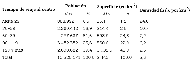 También se observan condiciones de accesibilidad al centro relativamente buenas (entre 30 minutos y una hora) en el área compacta -dentro de la CABA- más alejada de la red de transporte subterráneo que rodea en forma de anillo al núcleo de mayor accesibilidad, extendiéndose en forma tentacular por diferentes municipios de la provincia de Buenos Aires en torno al recorrido y las estaciones de la red de ferrocarriles. Estas áreas del aglomerado -pobladas durante la primera etapa de la expansión industrial y la suburbanización de los sectores populares en la ciudad, desde la década de 1940, en la que se incorporaron varias cabeceras de los actuales municipios del conurbano bonaerense- son las que hoy se identifican como zonas de nivel socioeconómico medio. En esta área más extensa (214 km2), habita más del doble de población que en el primer estrato (dos millones 300 mil personas) (Tabla 1).