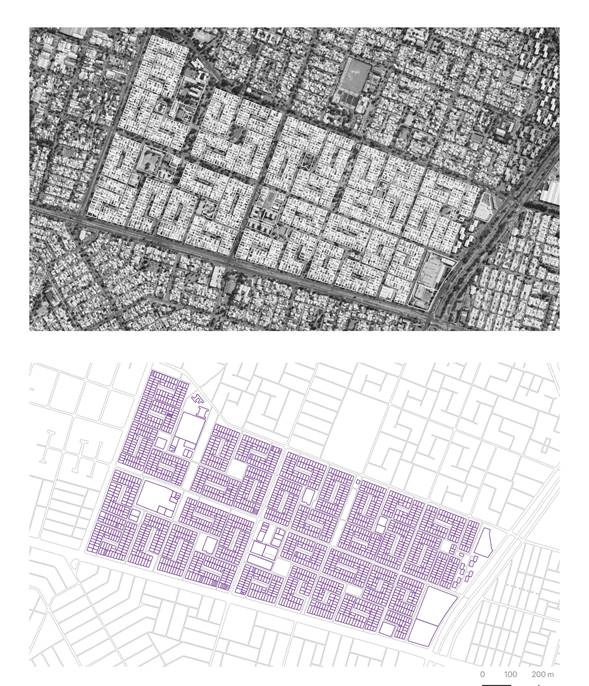 El lote, de uso residencial configuraba manzanas, macro-manzanas, y entre las manzanas, una red jerarquizada de calles y una red de espacios públicos (vacíos) de distintas escalas con destinos no residenciales tales como áreas verdes, equipamientos comunitarios e inclusive áreas comerciales (ver Figuras 3 y 4). Es decir, a partir del lote, se generaban el resto de los elementos de la forma urbana, entre ellos una red de espacios públicos.