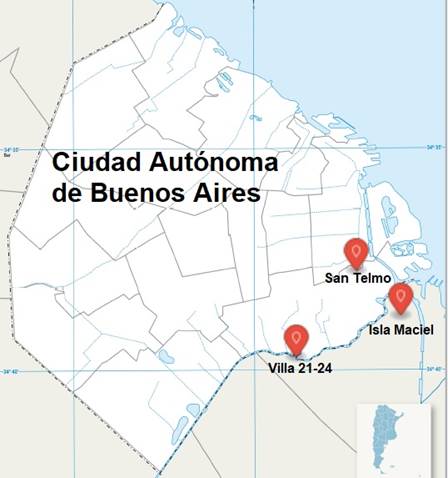 Ponemos en juego esta pregunta a partir de tres experiencias analizadas a continuación, teniendo en cuenta los actores que llevan adelante la acción, su emplazamiento y contexto: el embellecimiento de un bajo autopista en San Telmo (uno de los barrios más turísticos de la ciudad) por parte del Gobierno de la Ciudad de Buenos Aires, un proyecto de arte urbano desarrollado por docentes, artistas y vecinos de la Isla Maciel (una zona periférica y estigmatizada frente al área turística de La Boca) y la generación más espontánea de murales vinculados a la violencia y la religiosidad en la Villa 21-24 (barrio popular de la ciudad de Buenos Aires). Los datos relevados provienen de un abordaje etnográfico que remite al trabajo de campo de las autoras en los últimos años, incluyendo entrevistas a los actores involucrados (vecinos, artistas, referentes sociales), registros de observación en los espacios mencionados y observación con participación en eventos vinculados a la elaboración de los murales.