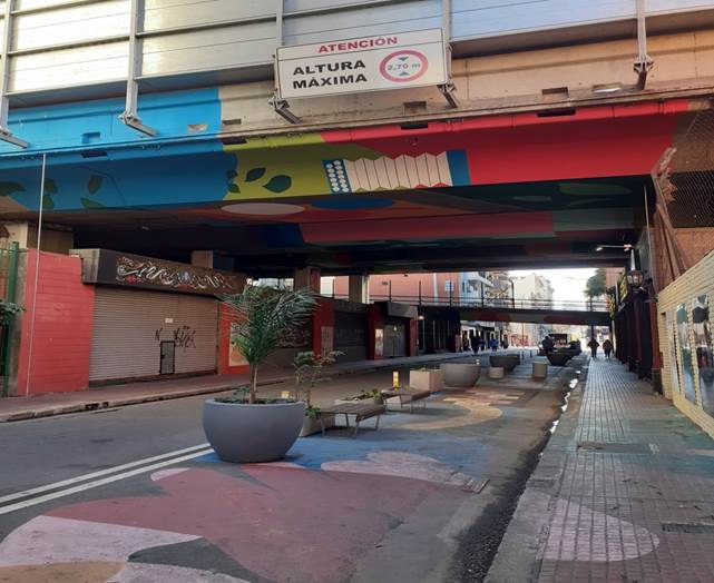 En primer término, observaremos una intervención desarrollada sobre fines del año 2020 (en contexto de pandemia), en el bajo autopista del casco histórico de la ciudad de Buenos Aires (San Telmo) (Figura 1). El diseño llevado a cabo en una calle (Defensa) ubicada debajo de una autopista partió de la idea del “vacío urbano” (negando las prácticas contestatarias reproducidas cada domingo por los negros del barrio que realizan llamadas de tambores) y de la necesidad de intervenir un “bajo autopista”. Con el apoyo del Gobierno de la Ciudad de Buenos Aires y del BID, Urbanismo Vivo (un equipo no gubernamental), junto a vecinos, artistas y comerciantes realizaron una serie de actividades (talleres, juegos, etc.) con el objetivo de rediseñar el espacio mediante una puesta en valor vinculada a la recuperación de la identidad del lugar escenificada en murales, colores, y la recreación de la cultura cotidiana (Lacarrieu y Laborde, 2021). Urbanismo Vivo parte de la idea de integrar a la ciudadanía al lugar de su habitar y en ese sentido señalaron: