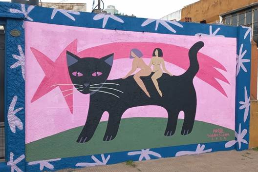 Y en esos lugares realmente no se hace nada, tenés una zanja, entonces el mural en sí no puede gentrificar […] yo estéticamente el 90% de las cosas que están pintadas en La Isla Maciel no me gustan, pero entiendo que hay otra lógica, yo le pinté un gato a una vecina, la vecina quería un gato, ¿qué le voy a decir yo? “no porque el arte, la academia, es mucho mejor esto”, o sea un poco creo que nosotros hacemos esos pequeños servicios a alguna gente [...] Sirve para una instancia sobre todo porque nosotros pintamos y, como vos viste, hacemos una olla o un disco [se refiere a una comida comunitaria], entonces después hay música, o un freestyle o la banda de cumbia. (Artista urbana, comunicación personal, agosto de 2020).