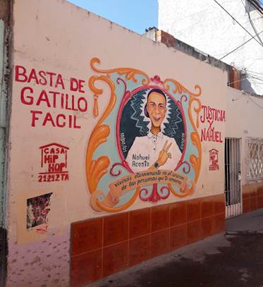 Presentamos un último caso en referencia a los usos del arte urbano en barrios vulnerables de la ciudad a partir de los murales vinculados a asesinatos de gatillo fácil a jóvenes enfrentados por la policía. Como se muestra a continuación la imagen de Nahuel Acosta pide justicia por él, si bien apoyado por la Casa Hip Hop del barrio (Villa 21-24 de Barracas, Figura 1) y bajo la traza de un mural fileteado y colorido (Figura 5). Estos murales suelen ir acompañados de santuarios hechos por las familias y situados en el espacio público relacionados con santos populares como el Gauchito Gil. Se trata de acciones estéticas que articulan arte y religiosidad popular despertando sensibilidades en contextos periféricos de la ciudad, donde el hacer artístico se manifiesta y se entiende de otro modo. Estas acciones creativas se diferencian de otras que hemos expuesto; a través de la posible visibilización de nuevas configuraciones, por ejemplo, de seguridad pública o seguridad ciudadana que, como señalara Walsh en su carta a Quijano, en la actualidad disuelven la distinción legal-ilegal, aunque reflejando la institucionalización del despojo y de las prácticas relacionadas con la violencia y la muerte.
