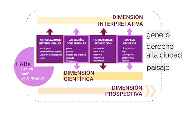 El trabajo aquí desarrollado se enmarca en dos espacios temáticos: el Laboratorio de Género y Urbanismo (GenUrb) en articulación con el Laboratorio de Ambiente y Paisaje (LaAP) del OFUT.
