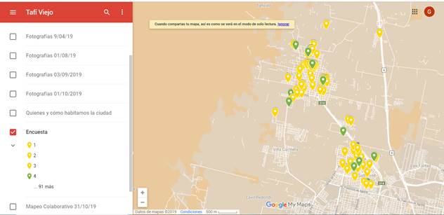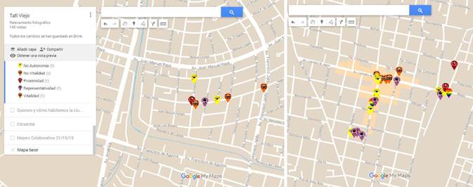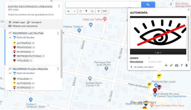 En el municipio de Tafí Viejo se replicó la experiencia de cartografía social con pictogramas elaborados sobre cualidades urbanas, en virtud de una demanda particular del gobierno local de generar un Proyecto Red contra Acoso Callejero, 20197. Las caminatas se acompañaron con registro fotográfico de las observaciones con respecto a las cualidades urbanas, geo-referenciándolas en cartografías digitales en línea de libre acceso (Figura 3).