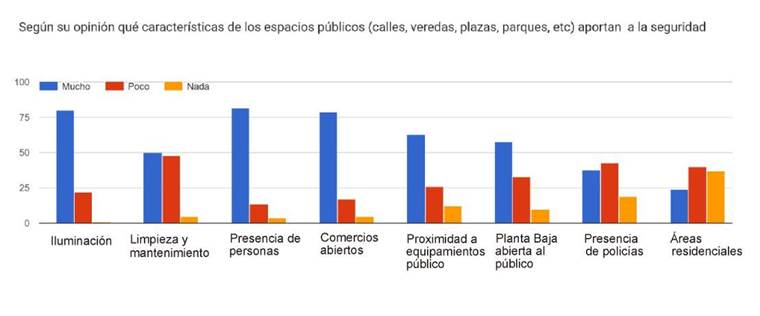 Al analizar los resultados, se advierte que el 80% de las personas encuestadas identifica que la presencia de iluminación, gente y comercios abiertos aportan a la seguridad y más del 90% plantean que la presencia de baldíos, viviendas abandonadas, calles estrechas sin salida y grandes avenidas con zonas despobladas aportan a la inseguridad (Figura 4).
