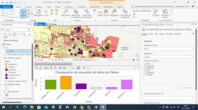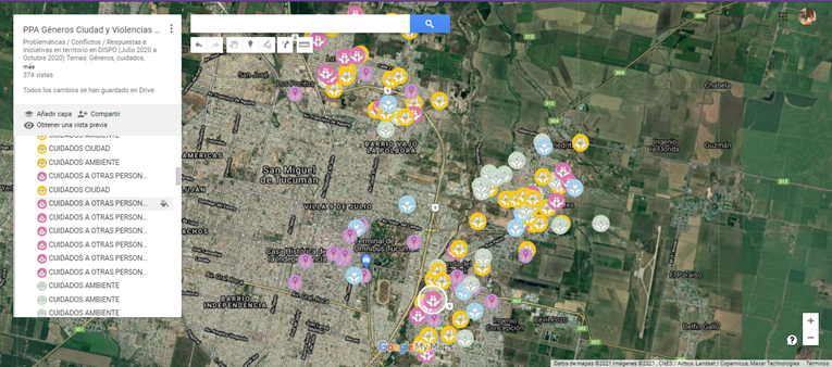 En el 2019, en articulación con organismos vinculados a la reivindicación de los derechos de mujeres y diversidades4, se mapean femicidios y transfemicidios perpetrados en la provincia de Tucumán, relacionados con otra información cuali-cuantitativa relevante cruzando los temas de espacio público, violencias, cuidados y derecho a la ciudad.