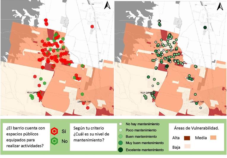 En algunas instancias se procedió a la integración en la plataforma geoespacial colaborativa con SIG (ArcGIS Online/PRO/ESRI), lo que permite verificar variables y realizar cruces con información previamente realizada y disponible en servicios de mapas abiertos del OFUT. En especial se trabajó a partir de tres zonas de vulnerabilidad (alta, media y baja) identificadas para el espacio metropolitano de Tucumán (OFUT et al., 2018).