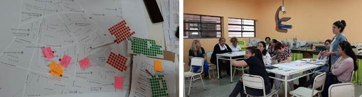 Otros métodos para la recolección de información fueron los mapeos en grupo, con mapas impresos y recursos gráficos, a partir de invitaciones a diferentes grupos e instituciones involucrados en las problemáticas barriales a la participación, reflexión y señalización crítica sobre estos cruces temáticos. Las actividades se orientaron a relevar los saberes, pareceres y datos de quienes se desplazan por allí habitualmente mediante recursos que estimulen a la participación (marcadores e íconos). Permitieron reflexionar junto a técnicos y técnicas del gobierno local, con la opinión de quienes lo habitan y transitan (Figura 9). Estos espacios fueron propiciados junto con las áreas gubernamentales encargadas de las políticas de género a nivel local.