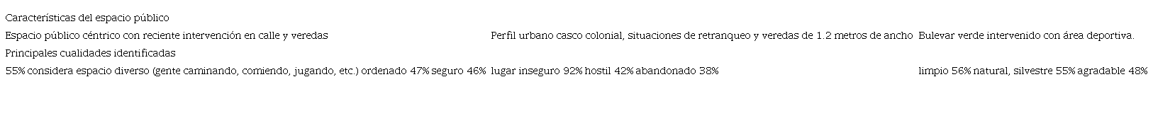 Con el aporte de la perspectiva de paisaje, se realizan ejercicios de percepción en relación a la elección de tres palabras para describir las imágenes, que responden a perfiles urbanos diversos, buscando establecer esos criterios de diseño a escala urbana que contribuyen a la percepción de las personas (Tabla 1).