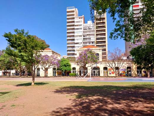 A pesar de las características del gobierno militar (1976-1983), Bohigas sostuvo los parámetros de una arquitectura pública interesada en el desarrollo de equipamientos culturales y espacios públicos multifuncionales. Quizá estos sentidos se acoplaron con algunas de las ideas de la dictadura, como la reivindicación de la herencia hispánica y su vínculo con el catolicismo, las similitudes funcionales y morfológicas de las escalinatas de la terraza del parque con la escalinata cívica del Monumento a la Bandera, el privilegio de las plazas secas sobre los espacios verdes y la intención de equipar los espacios públicos con centros culturales (Figura 6).