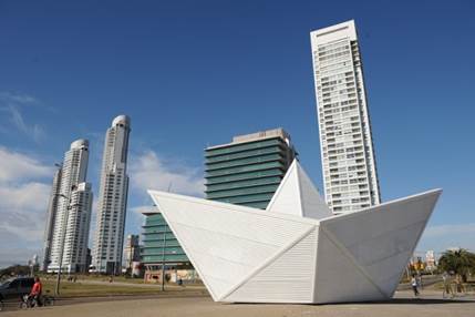 El desarrollo de Puerto Norte ha sido observado como un enclave cerrado de producción de torres con equipamientos para el ocio y la recreación que pueden definirse como torres jardín o torres country (Elguezabal, 2018) y cuyos consumidores son grupos sociales procedentes de otras ciudades -en especial, Buenos Aires- y/o poseedores de un poder adquisitivo que supera el promedio de Rosario. Los cercos perimetrales, los estacionamientos subterráneos, las apropiaciones de la zona de la ribera y la separación del núcleo urbano los convierten, durante los días hábiles, en espacios poco frecuentados. El espacio público que rodea a los edificios, además de compensar la apropiación privada y prestar el marco a las construcciones en altura, forma parte de los lugares abiertos para los habitantes de la ciudad que los visitan. Si bien su uso actualmente es reducido y distinguido (hecho que se agudizó con la pandemia) esta circunstancia quizá no sea definitiva. Inmerso en el torrente dinámico de los procesos históricos urbanos, el espacio público de Puerto Norte, con sus características híbridas, configura una membrana de transición entre las barreras simbólicas y urbanas, pero aun así queda abierto en algunos sectores para usos y usuarios no preestablecidos. En este sentido pueden aludirse las intervenciones que se desarrollaron en el Barquito de Papel, el símbolo del pasado logístico de Puerto Norte, que ha sido intervenido en varias ocasiones para hacer visibles problemáticas que aquejan al orden urbano de la ciudad (Versión Rosario, 2022). Asimismo, este espacio se ha convertido en escenario para reclamos ambientalistas (Retamoso, 2022).