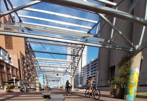 Tras la inauguración del Museo de Arte Contemporáneo Rosario (MACRO) y la Casa del Tango, en 2005, se cerró el proceso de equipamiento cultural público de la ribera. En ese año se inauguraron dos centros comerciales, los primeros de la ciudad: el Alto y el Portal Rosario. De estos espacios comerciales, los atributos arquitectónicos del Alto son los más relevantes, pues contaba con las mejores condiciones para iniciar la producción privada de espacios públicos y ejercer efectos de extensión e influencia sobre los espacios públicos circundantes (Figura 7). Casi en simultáneo, se iniciaron los desarrollos del proyecto de Puerto Norte con las Torres Dolfines Guaraní, luego completados por una serie de edificios de alta categoría, oficinas corporativas y espacios públicos. La distribución y los usos del suelo en Puerto Norte plantean una diferencia sustancial respecto a las intervenciones urbanas anteriores desplegadas sobre la ribera con la intención de reconvertir la infraestructura ferroportuaria. Asimismo, los centros comerciales y Puerto Norte se inscriben en la alianza público-privada para el desarrollo de los espacios públicos aledaños. No puede obviarse cierta tendencia hacia la privatización, donde lo público entra en contacto y queda afectado por una dinámica de acuerdo-subordinación a los intereses privados.