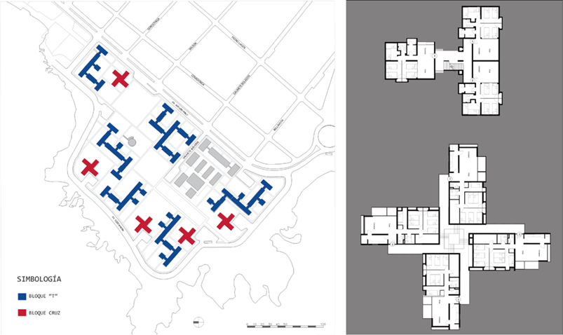 Esta nueva y final versión del proyecto habitacional, fue diseñada por los arquitectos Orlando Sepúlveda y Roland Vaca. En palabras de sus autores, se basa en la combinación de dos tipos de bloques, “uno de planta en cruz y aislado y otro de planta T que, al parearse por sus extremos, forma bloques continuos y quebrados” (Sepúlveda y Vaca 1966, p. 53) y que, en contraposición a los de tipo cruz, se disponen de forma aislada e individual en el perímetro de la remodelación (Figura 4).