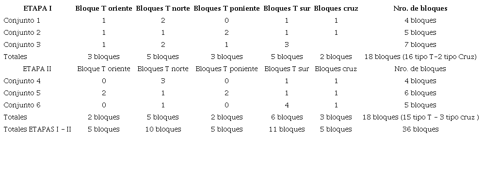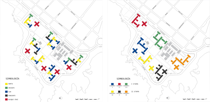 Al revisar el proyecto habitacional, se constata que se conformarían seis agrupaciones de edificios o superbloques (Figura 5), para las dos etapas de construcción, las que estarían constituidas de cuatro a siete bloques de planta tipo T (acompañados en algunos casos por un bloque de planta tipo cruz) sumando en total 36 bloques de cuatro o cinco pisos, dependiendo de la topografía del lugar de emplazamiento, como se indica en tabla resumen (Tabla 1).