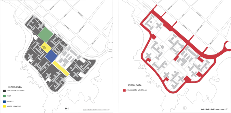 La ausencia de vías de circulación vehicular al interior del conjunto habitacional, que confina el uso del automóvil a los estacionamientos ubicados en el perímetro del conjunto y cercanos a los edificios y servicios comunitarios, evidencia la clara intención de generar un conjunto habitacional a escala humana y que privilegie la circulación peatonal (Figura 6).