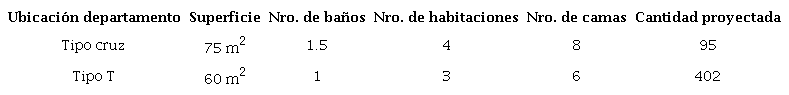 Finalmente, en cuanto a la tipología y características de los departamentos, se destaca el que cuentan con “un mínimo de dos orientaciones para facilitar la ventilación y las vistas” (Sepúlveda y Vaca, 1966, p. 54) y que se manifiesta, ya sea por los balcones para los departamentos ubicados en los bloques T o en los corredores de acceso para los departamentos en los bloques tipo cruz. Las características en torno a tamaño y programa, se exponen en la Tabla 2.