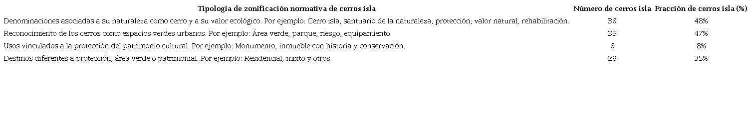 De los 75 cerros, 26 (35%) cuentan con regulaciones o normativas, expresadas en zonificaciones de uso, como áreas residenciales (Tabla 1). A su vez, un 47% de los cerros tienen indicaciones sobre una totalidad o parte de ellos, de destino como áreas verdes urbanas (ej. parque, equipamiento comunal) y un 48% como áreas naturales (ej. denominación de cerro isla, santuario de la naturaleza, valor ambiental, etc.). El 24% (18) de los cerros tiene ambos destinos al mismo tiempo, dada la diferenciación entre tipos de planes territoriales y/o zonificaciones internas en cada cerro. Finalmente, seis (8%) de los cerros están reconocidos como monumentos históricos (Tabla 1). En el Anexo 2 se encuentra más información sobre la zonificación normativa de cada cerro según cada tipo de instrumento.
