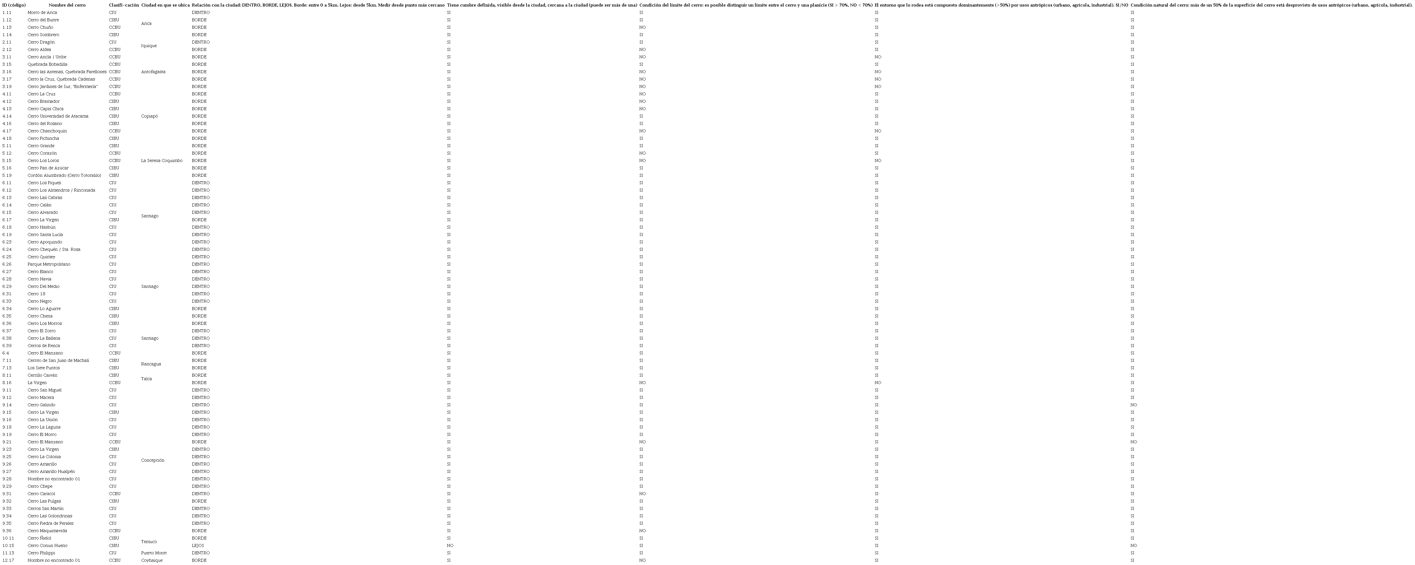 Se identificaron todos los cerros ubicados dentro y cerca de la zona urbana de las ciudades seleccionadas, registrando su nombre, localización geográfica y características generales (superficie, altitud, cobertura vegetal, porcentaje de urbanización, estado de su vegetación, edificaciones relevantes). Esto se llevó a cabo mediante una revisión de mapas e imágenes satelitales disponibles en Google Maps y Google Earth Pro, cartografía oficial (IDE Chile) y revisión documental. Se identificaron los cerros total o parcialmente incluidos dentro del área urbana, utilizando como base el “área urbana consolidada” del Instituto Nacional de Estadísticas (2018). Luego se realizó una digitalización del borde de cada cerro en la plataforma ArcGIS Online. Se identificaron tres tipologías de cerros isla urbanos: (i) Cerros isla urbano (CIU) incluidos en su totalidad dentro del polígono “área urbana”; (ii) Cerros isla que están en el borde urbano (CIBU); y (iii) Cerros que, pese a formar parte de un cordón montañoso o una formación más extensa, tienen una relación estrecha con la ciudad por ser adyacentes al área urbanizada (Cerros de cordones en el borde urbano; CCBU).