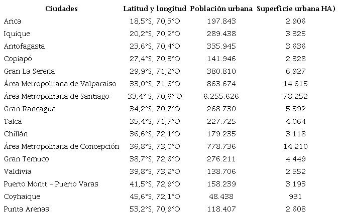 Se analizaron en detalle las 16 ciudades que son capitales regionales de Chile, ya que tienen una relevancia político-administrativa superior al de otras ciudades. Mayoritariamente representan las ciudades más pobladas de Chile, y son representativas del gradiente latitudinal y longitudinal del territorio y de ciudades de distintos tamaños. Una descripción más detallada se presenta en el Anexo 2.
