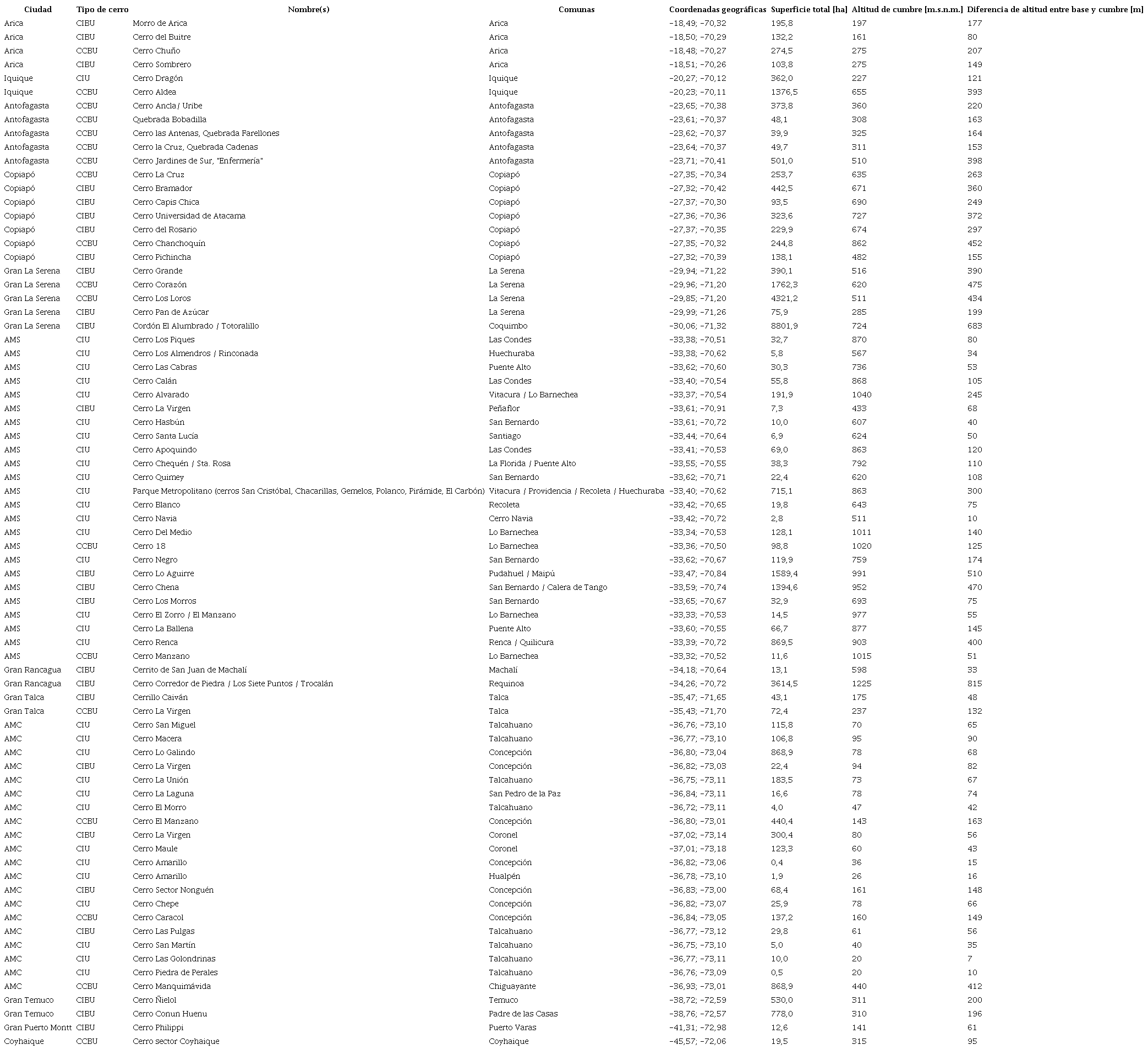 Se identificaron 75 cerros dentro de las áreas urbanas o en su borde, en 12 de las 16 capitales regionales de Chile. De éstas, 10 tuvieron más de un cerro (Anexo 4). De los 75 cerros, 32 corresponden a cerros isla urbanos propiamente tales (CIU), 24 son cerros isla que están en el borde urbano (CIBU), rodeados mayormente de usos antrópicos o áreas sin vegetación (en las ciudades del norte). Otros 19 cerros forman parte de un cordón montañoso y están localizados en el borde urbano (CCBU), pero por su relación morfológica con la ciudad podrían ser relevantes como espacios naturales o seminaturales conectados estrechamente con la ciudad. En total, hay 36 comunas con cerros isla urbanos. Existen cinco cerros con una altitud de cumbre superior a 1.000 m s.n.m., cuatro de ellos ubicados en una comuna pre-cordillerana (Lo Barnechea) y uno en el borde de la ciudad de Rancagua. A su vez, tres cerros tienen una diferencia de altitud entre la cumbre y la base mayor a 500 metros, coincidiendo con el cerro anteriormente citado de Rancagua, y sumándose un cerro en Santiago y otro en Coquimbo.