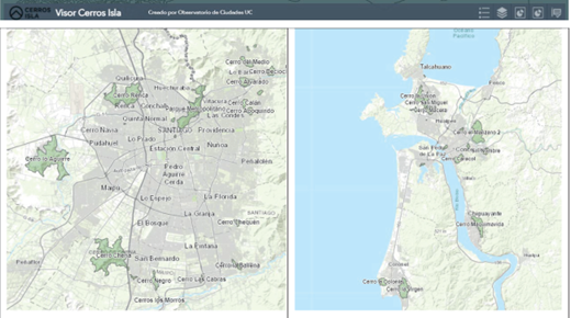 La localización precisa y extensión de cada uno de estos cerros se presenta en el Anexo 4 y también en el visor -elaborado para este trabajo- alojado en la página web de la Fundación Cerros Isla (https://www.cerrosisla.cl/cerros-isla-de-chile). Del mismo modo, el Atlas Nacional Cerros Isla, disponible en el mismo sitio web, dispone de una ficha técnica con antecedentes detallados de uso y cobertura del suelo, patrimonio y edificaciones, y normativa territorial. En la Figura 1 se muestra el contenido del visor disponible en el enlace indicado y un acercamiento a las dos ciudades con más cerros isla: las áreas metropolitanas de Santiago y de Concepción.