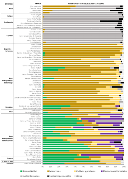 De acuerdo a la información utilizada, los cerros de Arica, Iquique, Antofagasta y Copiapó están en más de un 90% compuestos por suelos sin vegetación; con la excepción del Morro de Arica y el Cerro El Buitre de la misma ciudad que -de acuerdo a la fuente utilizada para obtener los resultados-, tienen un 40% y 35% de matorrales. Sin embargo, en la práctica, son suelos sin vegetación (o con escasa vegetación) que podrían tener un error de clasificación en la fuente original. Las coberturas cambian significativamente en La Serena y Coquimbo (donde los matorrales son mayoritarios) llegando casi al 100% en algunos cerros. En AMS, Rancagua y Talca también predominan los matorrales con la excepción de los cerros Renca, San Juan de Machalí y Calván que tienen menos del 50% de su superficie con matorrales. En estas ciudades se observa una mayor diversidad y variabilidad en el conjunto de coberturas de suelo presentes. En la zona central emerge la presencia de bosque nativo como tipo de cobertura, aunque en muchos casos corresponde a acciones de forestación (p. ej. Parque Metropolitano de Santiago). También aparece la cobertura de cultivos y praderas, en algunos casos siendo ésta muy importante, como en los cerros de Renca (52% praderas), Las Cabras (25%), Quimey (35%), La Virgen de Peñaflor (36%), Negro (26%), Lo Aguirre (26%) y Chena (32%); todos del AMS. Hacia el sur, las coberturas de bosque nativo pasan a ser importantes en varios cerros, como por ejemplo en Concepción, los cerros La Laguna y El Manzano; en Temuco el cerro Ñielol; y en Puerto Varas el cerro Philippi con más de un 50% de sus superficies cubiertas por bosques. En contramano, también comienza a ser relevante la extensión de plantaciones forestales, especialmente en el Área Metropolitana de Concepción, llegando a coberturas superiores a 30% en los cerros Macera, San Miguel y La Unión de Talcahuano, en el cerro Caracol, que es también Parque de escala metropolitana en Concepción y en el cerro Manquimávida en Chiguayante, incendiado parcialmente el año 2020.