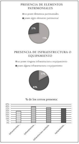 De los 75 cerros analizados, 27 (36%) poseen algún elemento patrimonial y 62 cerros (83%) poseen otros elementos edificados (infraestructura o equipamiento), existiendo algunos casos donde conviven ambos tipos de edificación. Sobre la infraestructura y equipamiento, se puede destacar que el 28% de los 62 cerros que albergan este tipo de edificación poseen infraestructura productiva o comercial, 39% infraestructura relativa a energía, telecomunicaciones o transporte, 37% infraestructura sanitaria y 35% posee algún equipamiento educacional, de salud, deportivo, penitenciario o cementerios.