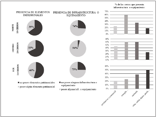 Una minoría (30 a 40%) de los cerros alberga algún elemento patrimonial y la gran mayoría de ellos (75-95%) posee una o más infraestructuras o equipamientos. Al respecto, en las ciudades del norte (Arica a Coquimbo-La Serena) existe una prevalencia de infraestructura relativa a energía, telecomunicaciones o transporte. En la AMS, la mayoría de los cerros que presentan infraestructura y equipamiento albergan infraestructura sanitaria o elementos relativos a energía, telecomunicaciones o transporte. Sin embargo, en esta zona, la presencia de infraestructuras asociadas a actividades productivas (ej. extracción de áridos y agricultura) es más relevante que en cualquier otra zona del país. Por último, en los cerros localizados al sur del AMS llama la atención la presencia de equipamientos vinculados al ámbito de la educación, salud, deporte o los cementerios, muy conectados con la trama urbana. En el Anexo 5 se presentan más detalles respecto a estos elementos.