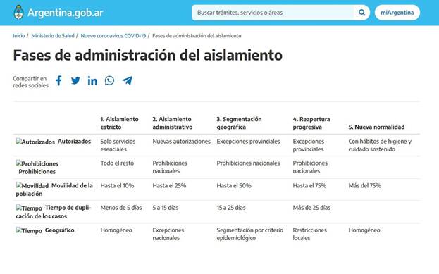 Terminando el mes de abril de 2020, con el Decreto N.º 408, se difundió un sistema de cinco fases de administración del aislamiento a nivel nacional en una transferencia de las decisiones sanitarias a los gobiernos locales. A partir de allí, cada municipio pudo desarrollar en su territorio actividades acordes a una gestión controlada de la propagación de la enfermedad, que permitía reactivar actividades económicas que habían sido suspendidas en una primera instancia. Ese sistema se sintetiza en el siguiente cuadro comparativo (Figura 3), donde se evidencia la mayor o menor apertura de actividades según la fase atravesada por cada jurisdicción.