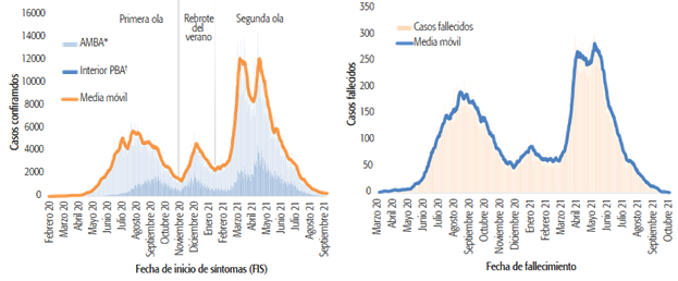 La administración de la emergencia sanitaria, los casos confirmados y las respectivas muertes por el virus COVID- 19, tuvieron cierto correlato con los procesos de ampliación o restricción del aislamiento. Como fue mencionado, en el caso particular de la Argentina, el proceso de aislamiento fue iniciado previamente a la difusión masiva del virus, como manera de prevenir su contagio. Es por esto que, el primer pico de casos, o primera ola, se termina efectivizando cuatro meses después del inicio del ASPO (Figura 4), en donde se registran casi seis mil casos diarios en la Provincia de Buenos Aires, coincidiendo con el pico de muertes.