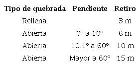 1. En taludes con pendientes mayores a 45° y más a 3 m de altura, se debe cumplir: a. Pendientes entre 45° y 60° deben tener un retiro de 10 m desde el borde superior. b. En pendientes mayores a 60° este retiro será de 15 m 2 . En taludes con pendientes mayores a 60° y más de 5 m de altura se debe presentar estudio de suelos que garantice su estabilidad, previa construcción. 3. En taludes producidos por cortes para vías se aplicará el retiro según zonificación y el derecho de vía reglamentario correspondiente, excepto en casos de línea de fábrica, que requieren retiro mínimo de cinco metros (Concejo del Distrito Metropolitano de Quito, 2011b).