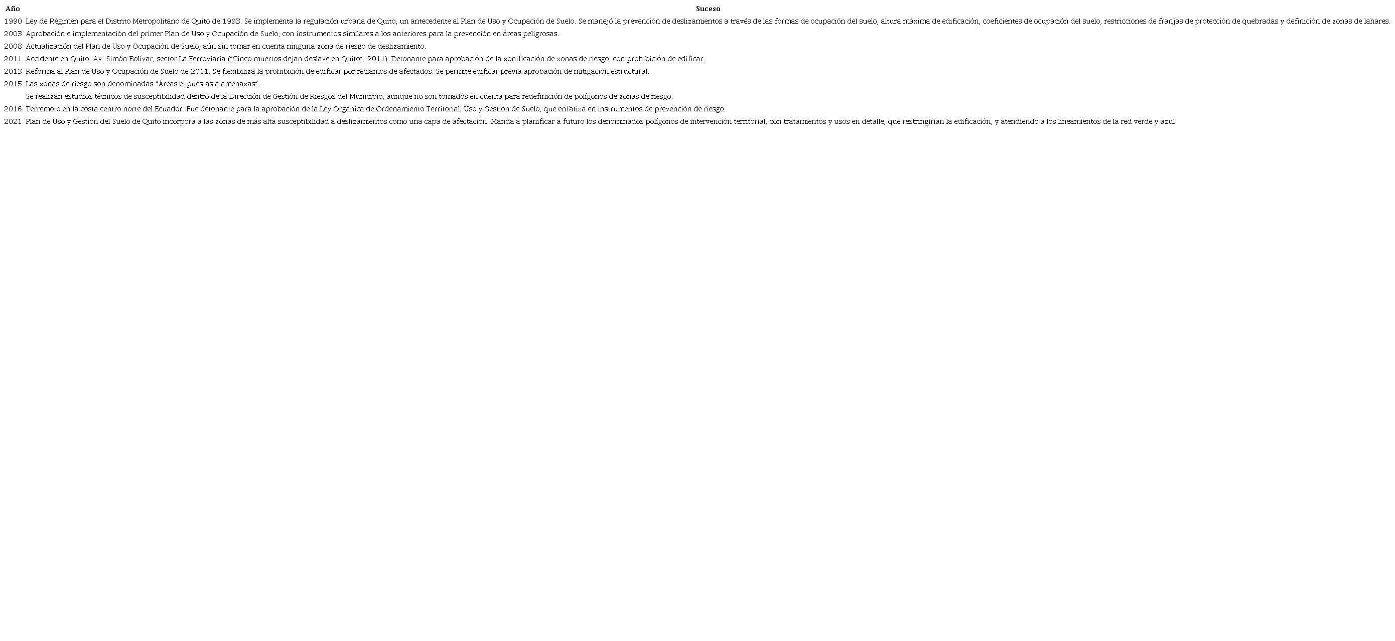 Hasta entonces, decenas de deslizamientos ocurrían anualmente, con gran impacto en las comunidades afectadas. Sin embargo, el deslizamiento del 30 de abril del 2011 en el sector La Ferroviaria, en la Avenida Simón Bolívar, vía expresa que atraviesa Quito de norte a sur por el oriente, cobró la vida de cinco personas y dejó a seis heridas (Jaramillo, 2014). Este fue el detonante para acelerar el proceso de definición de zonas de riesgo de deslizamiento, prohibiendo nuevas edificaciones en estas áreas.