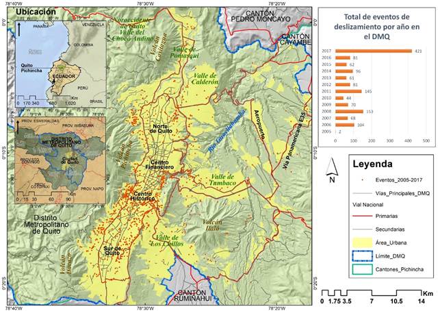 Quito, así como otras ciudades andinas, ha experimentado en las últimas décadas procesos extensivos de urbanización marcados por un desarrollo informal difícil de administrar (Carrión y Erazo Espinoza, 2012; Inostroza, 2017). El crecimiento de las periferias en condiciones de vulnerabilidad, junto con variabilidades climáticas cada vez más perceptibles a través de eventos extremos, han intensificado el riesgo (D’Ercole et al., 2009; UNISDR, 2018). Uno de estos eventos extremos de precipitaciones más críticos ocurrió durante abril del 2017, el cual anegó importantes edificios del centro financiero local (Santillán y Zamora, 2021). Ese mismo año, se produjeron 430 deslizamientos; el triple del máximo registrado antes (Figura 1).