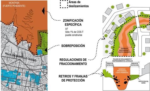 Las capas de afectación preventiva ante amenazas, sobrepuestas a los lotes, restringen edificabilidad (Figura 2). En Quito se aplicó este instrumento para prevención de deslizamientos desde el Plan de Uso y Ocupación de Suelo 2016 (antigua zonificación de zonas de riesgo). En el plan 2021, actualmente vigente, la capa de afectación fue equivalente a la de alta susceptibilidad a deslizamientos, según lo determinado por la Dirección Metropolitana de Gestión de Riesgos.