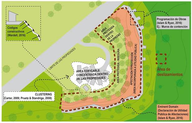Las servidumbres, los derechos de paso y los derechos de uso, promueven la protección de áreas afectadas por una amenaza a cambio de un beneficio o pago municipal, a cambio de su desocupación para actividades recreativas o de conservación (Islam y Ryan, 2016). En Ecuador apenas existe una propuesta de ley de servidumbres ecológicas, direccionada a áreas extensas para conservación natural (Ministerio del Ambiente del Ecuador, 2021). Esta herramienta también podría aplicarse a zonas peligrosas (Figura 4).