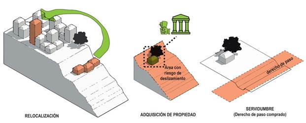 Como herramientas de gestión de suelo para reducción de riesgo de deslizamientos, pueden incluirse: