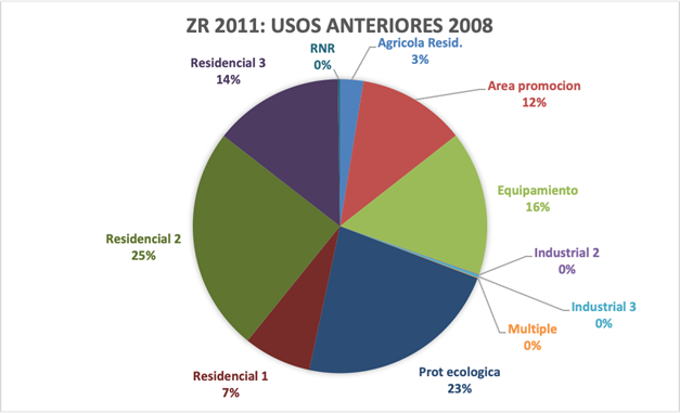 El plan previo a las zonas de riesgo del Plan de Uso y Ocupación de Suelo del 2011 fue el del 2008, que no tenía esta categoría sobre el riesgo de deslizamiento. Comparativamente, casi la mitad del área de zonas de riesgo 2011 (46%) correspondía a usos residenciales tipos 1, 2 y 3 (baja, mediana y alta densidad, respectivamente) del año 2008. Sorprende también que un 16% del área de zonas de riesgo antes era de uso destinado a “Equipamiento”, y un 12% a “Área de promoción” (área destinada para grandes proyectos urbanos). Sólo el 23% de polígonos de zonas de riesgo correspondía al uso “Protección ecológica” (Figura 6).