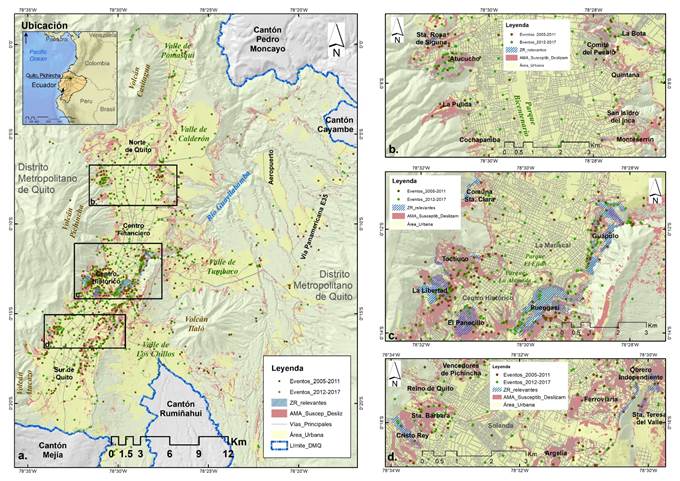 A partir del 2013, el Comité de Operaciones de Emergencia Metropolitano comenzó a organizar un registro de eventos de deslizamientos, cuyo período entre 2005 y 2017 estuvo disponible para esta investigación. Paralelamente, la Dirección Metropolitana de Gestión de Riesgos realizó estudios de susceptibilidad a deslizamientos, cuyos resultados fueron también usados en esta investigación, particularmente los referidos a las áreas con alta y muy alta susceptibilidad. Para identificar las posibles afectaciones a propietarios reclamantes de zonas de riesgo, se realizó la sobreposición entre las zonas de riesgo que se aplicaron durante toda la década de 2010, las más altas susceptibilidades a deslizamientos y los eventos suscitados entre 2005 y 2017, como se explicó en la metodología.