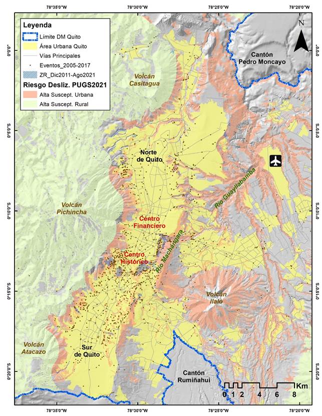 Del total de 1433 eventos, apenas 117 (8%) coincidieron con la zonificación de zonas de riesgo (294 polígonos del plan de 2011). De estos, solamente una mínima parte coincide con las más altas susceptibilidades a deslizamientos y los eventos suscitados entre 2005 y 2011. Esta operación determinó a las zonas de riesgo relevantes, que realmente estarían previniendo nuevo riesgo de deslizamientos y que se concentran en la periferia del Centro Histórico, en los barrios Siguna y Monteserrín en el norte y en los barrios Cristo Rey y al oriente de La Ferroviaria en el sur (Figura 7).
