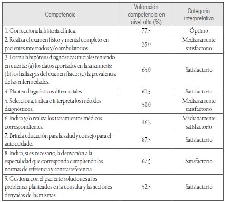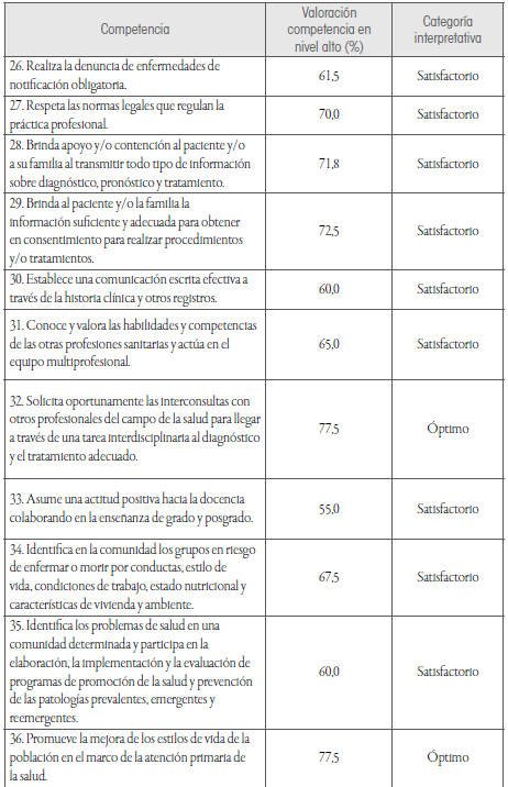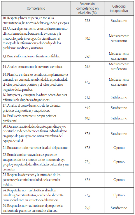 De las competencias que tienen un desarrollo óptimo, y en relación con la misión de la facultad de formar médicos con altos ideales de servicio, se destacan: (21) busca ante todo mantener la salud del paciente,(22) brinda la máxima ayuda a sus pacientes anteponiendo los intereses de los mismos al suyo propio respetando las diversidades culturales y sus creencias, (23) respeta los derechos y la intimidad de los pacientes y la confidencialidad de la consulta médica, y (36) promueve la mejora de los estilos de vida de la población en el marco de la atención primaria de la salud. Es sumamente importante mencionar que el hecho de que los estudiantes hayan destacado el desarrollo óptimo de estas competencias permite apreciar, en la formación del médico, la abnegación y el espíritu de servicio como fundamento de la excelencia profesional.
